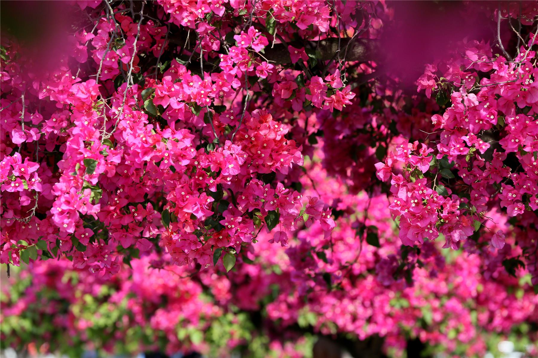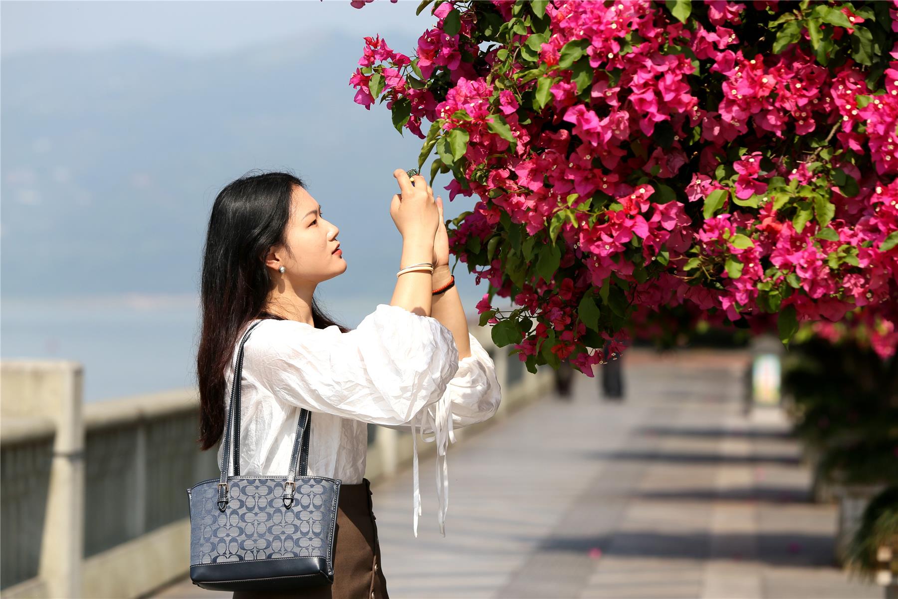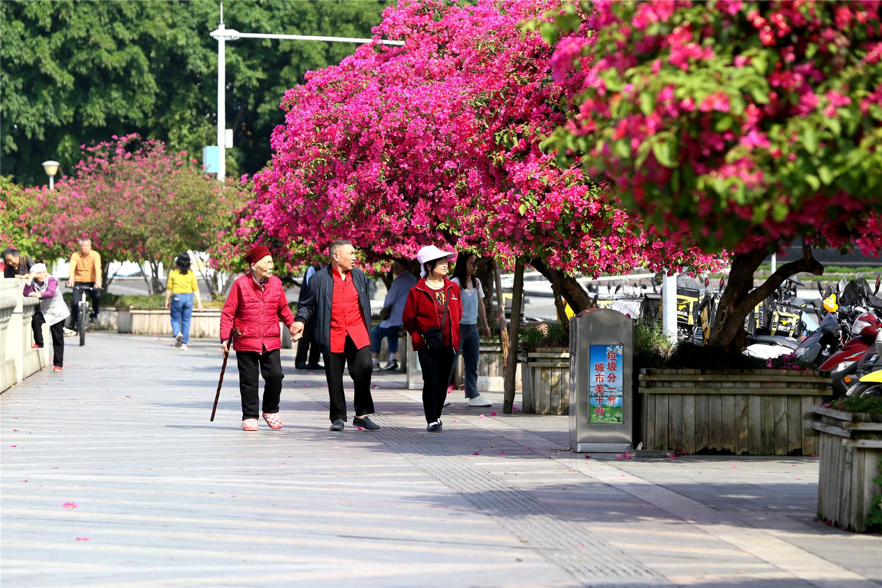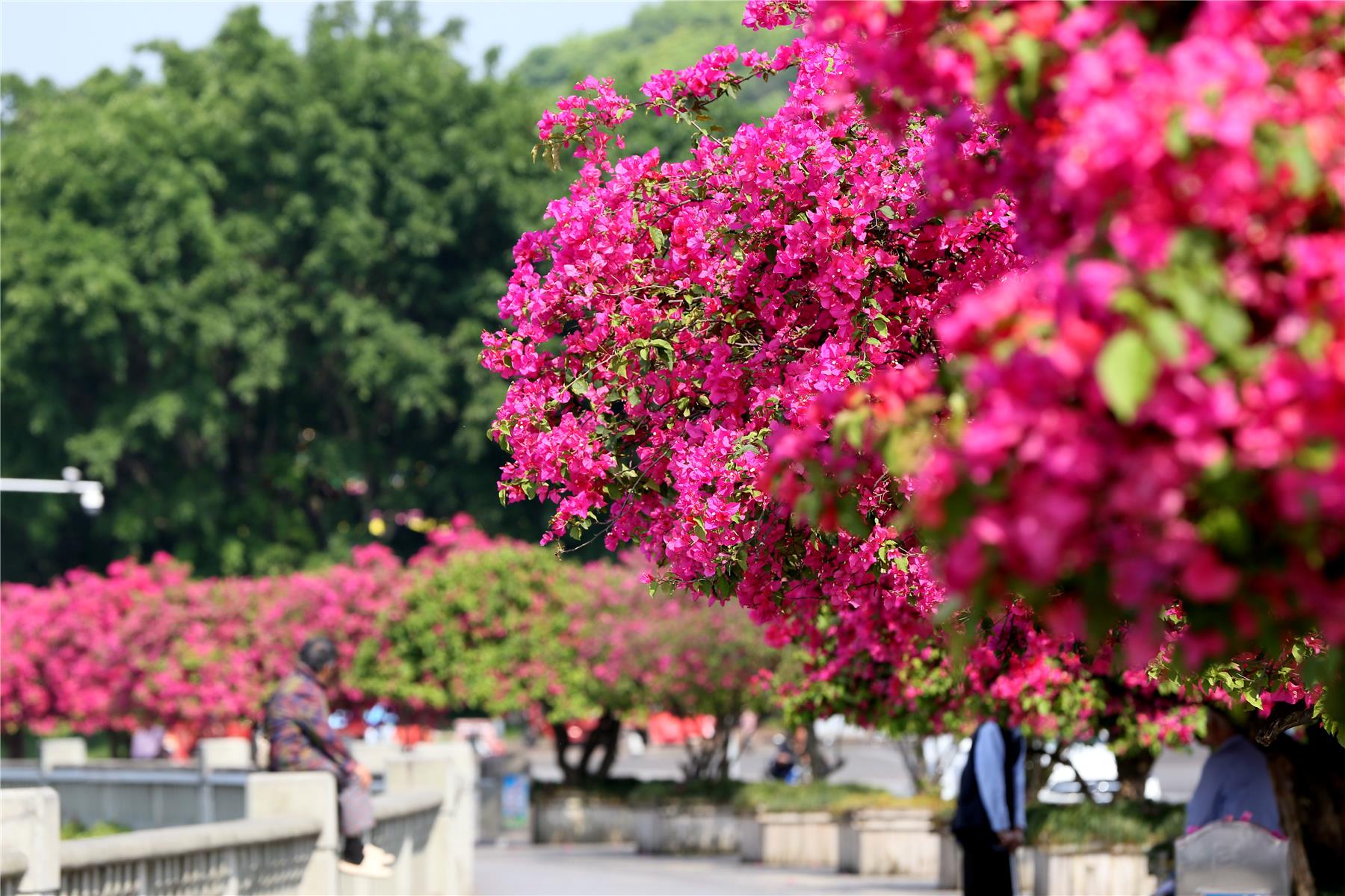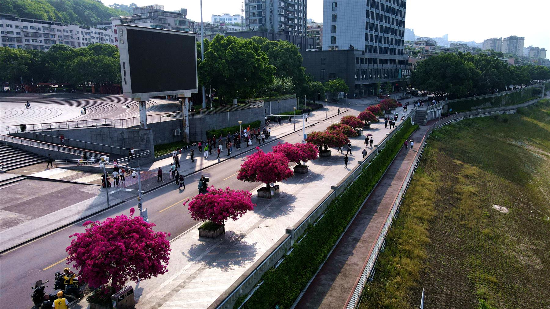 在两江广场,放眼望去,成排的三角梅热情绽放,开得花团锦簇。走近细细观赏,有的恣意怒放,随风轻轻摇曳,灿若云霞;有的含苞待放,簇拥在一起,层层叠叠。从空中俯瞰,沿路盛开的三角梅宛如披在江边的一条彩带,与青山绿水相映成趣,成群的游人穿行其间,令人流连忘返。