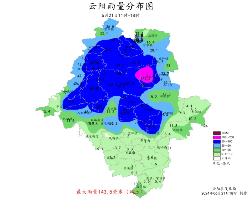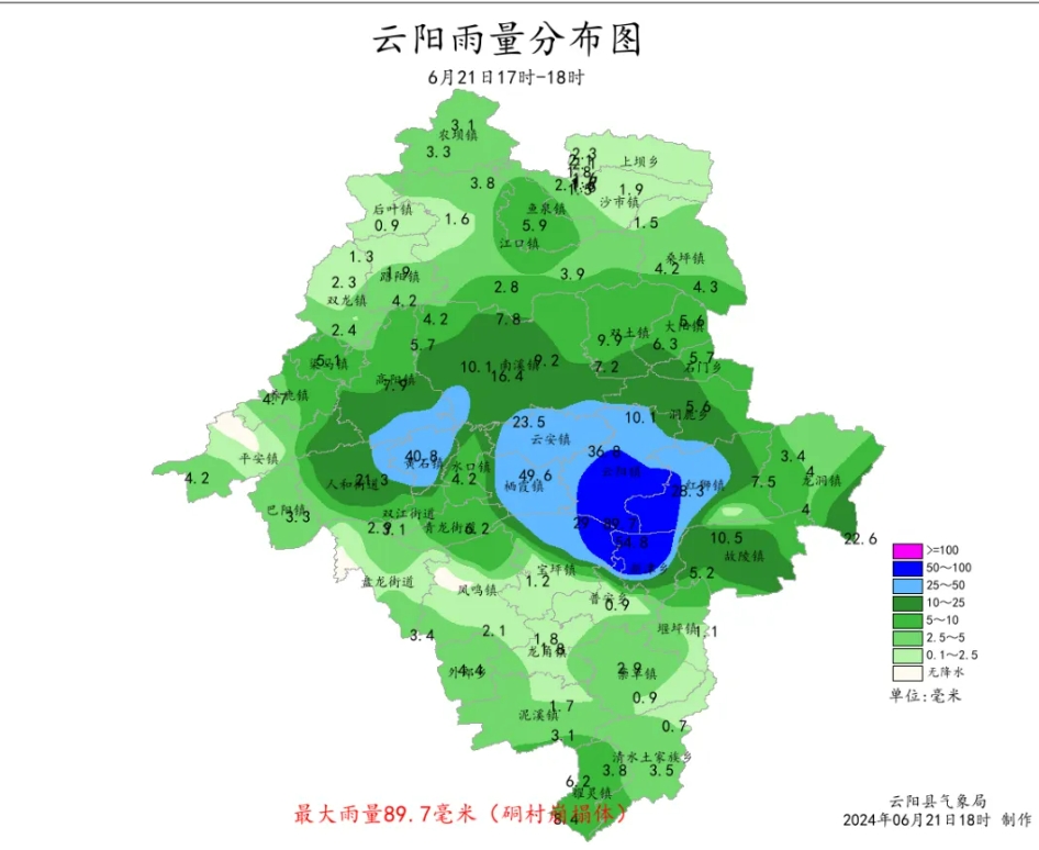 最大小时雨量89.7毫米(云阳镇,21日18时)