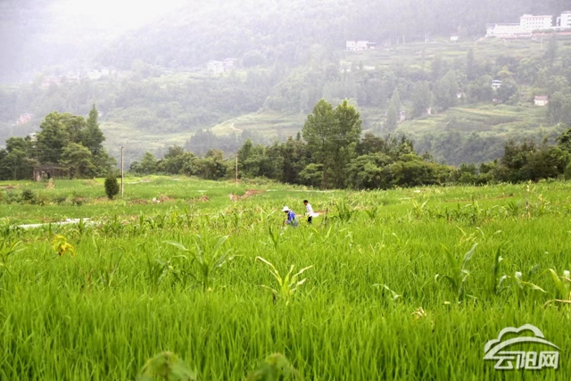 在南溪镇平安村,连片的水稻在微风的吹拂下随风荡漾,稻田垄沟边水流淙淙。随着雨季来临,稻田蓄水良好,正是投放鱼苗的好时机,村民们正在忙着将鱼苗从装载车上卸下投放进稻田里。