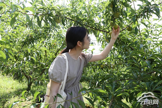 走进李子园内,翠绿的李树郁郁葱葱,连成一片。一颗颗李子饱满圆润,泛着微亮的黄色,随手摘下,轻轻一咬,清脆的声音从齿间嘣出,丝丝香甜令人回味无穷。游客们呼吸着乡间新鲜的空气,一边品尝一边采摘,不一会儿便收获满满。