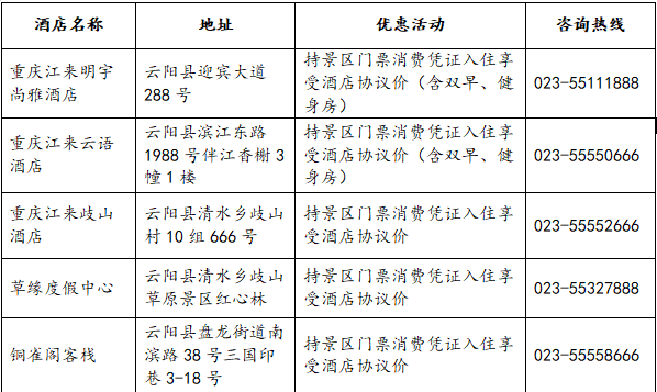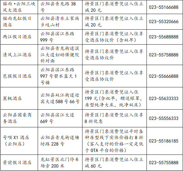 1.凭县内酒店(见下表)住宿消费凭证,享受龙缸景区(咨询电话:023-55333111)和张飞庙景区(咨询电话:023-55381666)门票8折优惠,即:龙缸景区门票80元/人,张飞庙景区28元/人。