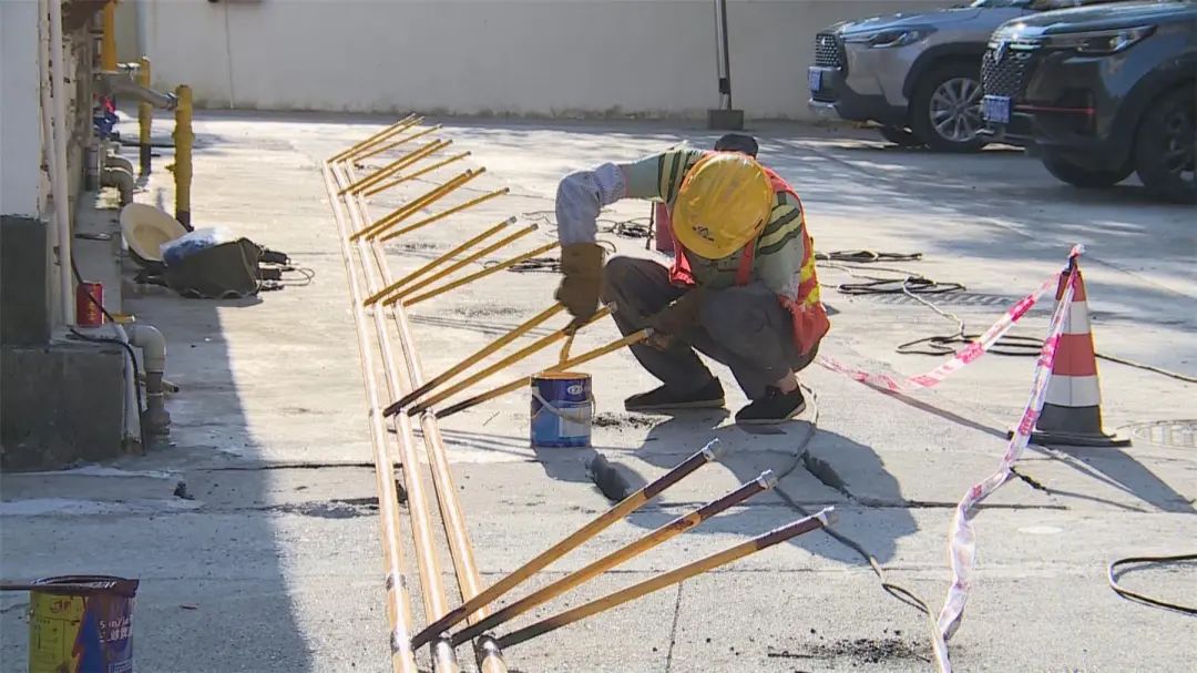 工作人员对小区内老旧燃气管道进行更新改造施工
