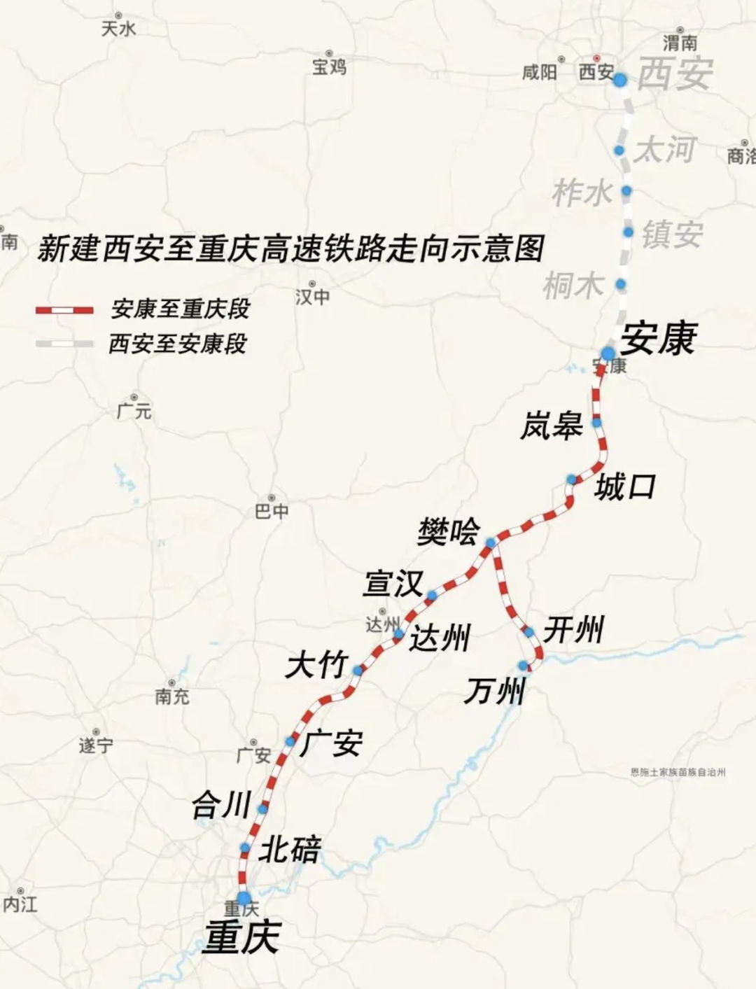 西渝高铁是我国“八纵八横”高铁网京昆通道和包(银)海通道的重要组成部分。西渝高铁康渝段起自安康西站,经陕西省安康市,重庆市城口县,四川省达州市、广安市,重庆市合川区、北碚区,引入重庆枢纽重庆西站。正线全长478公里,设计时速350公里。
