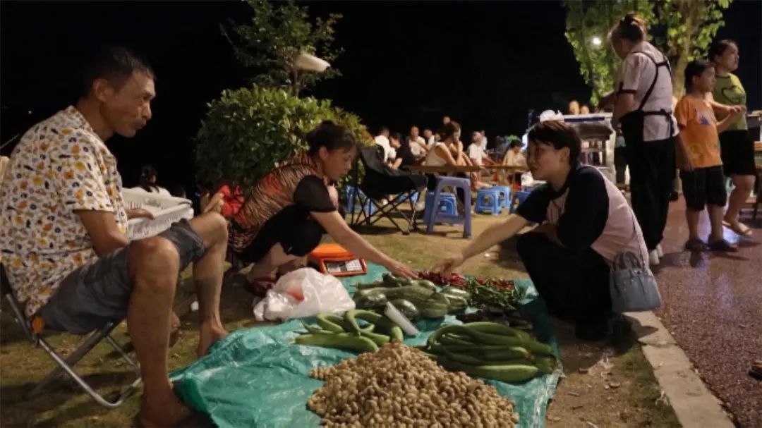 “每年一到天气热的时候,我们天天都要来纳凉,现在越来越热闹,氛围越来越好。”一位纳凉市民表示。在阴河坝,道路两旁的小摊位摆满了各种小吃和应季农家蔬果,有烧烤、冰饮等美食,也有黄桃、李子、丝瓜等农产品售卖,不仅为人们提供了亲近自然、享受宁静的好去处,更增添了浓浓的烟火气。