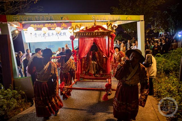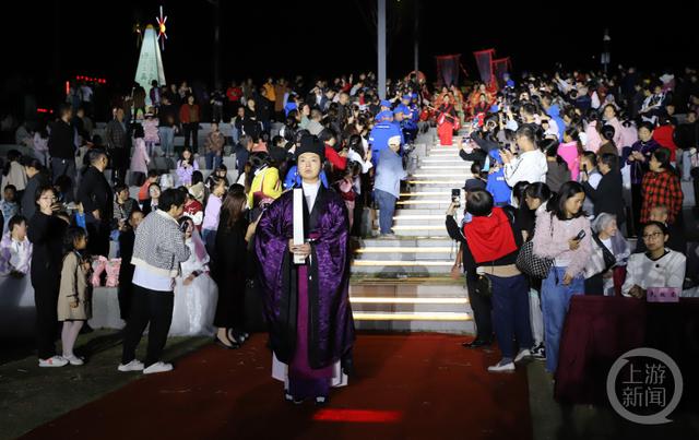 10月5日晚,在云阳县月光草坪一生一世长廊,行加冠之礼后的“新婿”整装待发,用八抬大轿的方式迎娶“新妇”。