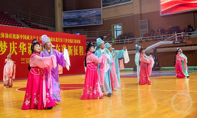 广场舞《龙腾盛世新云阳》拉开了活动的序幕,大型舞蹈《黄河水从家门前流过》《不忘初心》,管乐大合奏《华诞颂》以及黄梅戏、京剧、太极拳、健身球操、柔力球、彩带舞等轮番上演,演出现场高潮迭起。