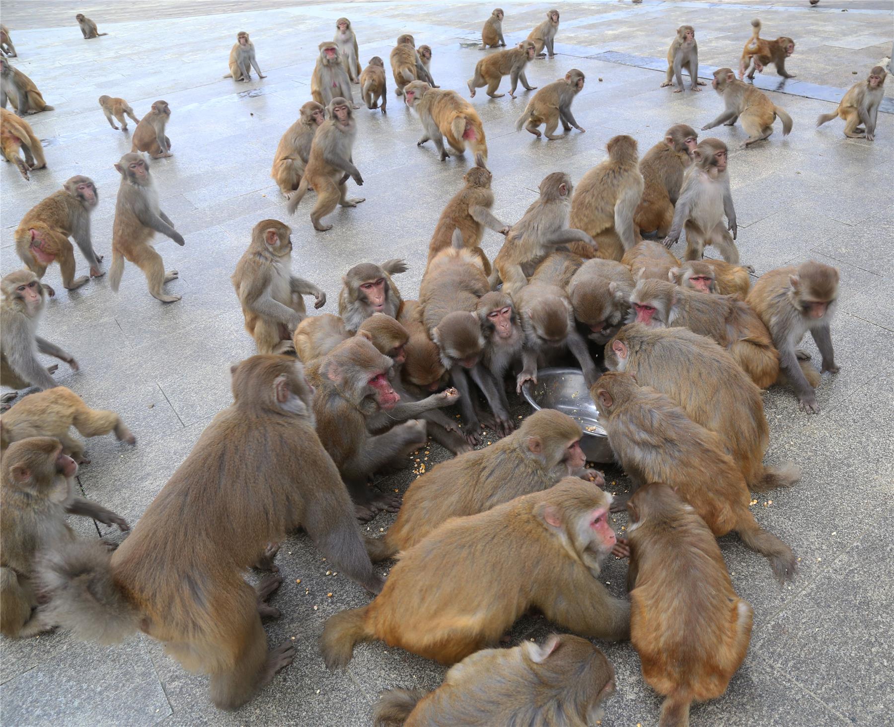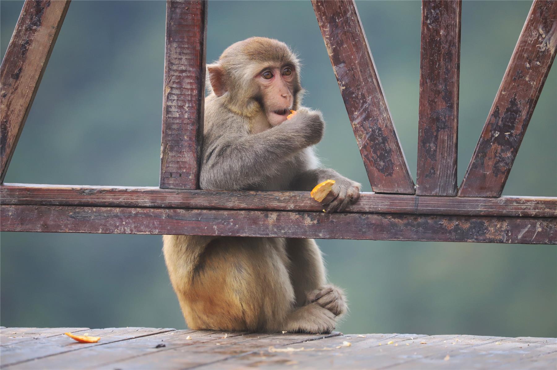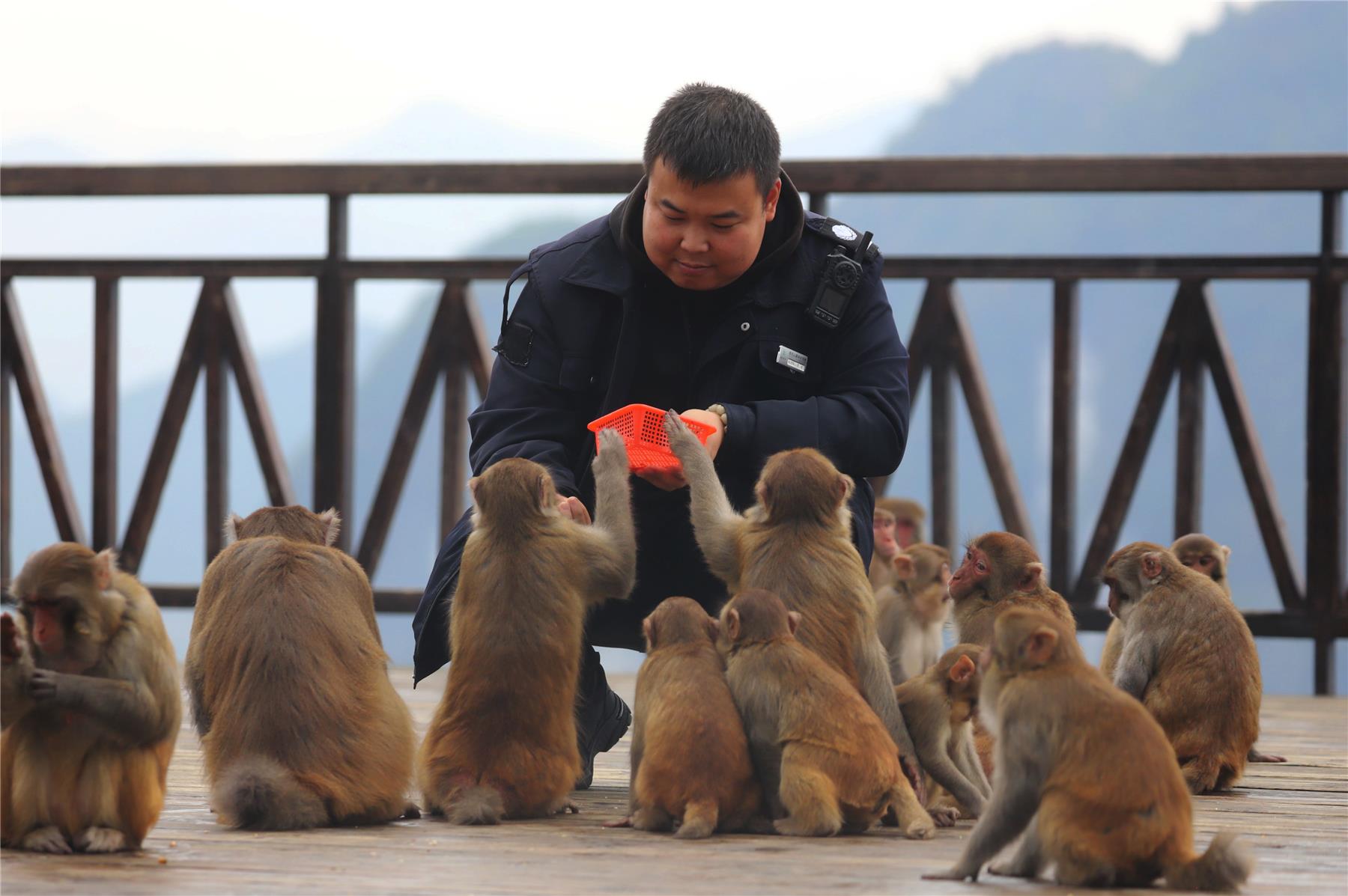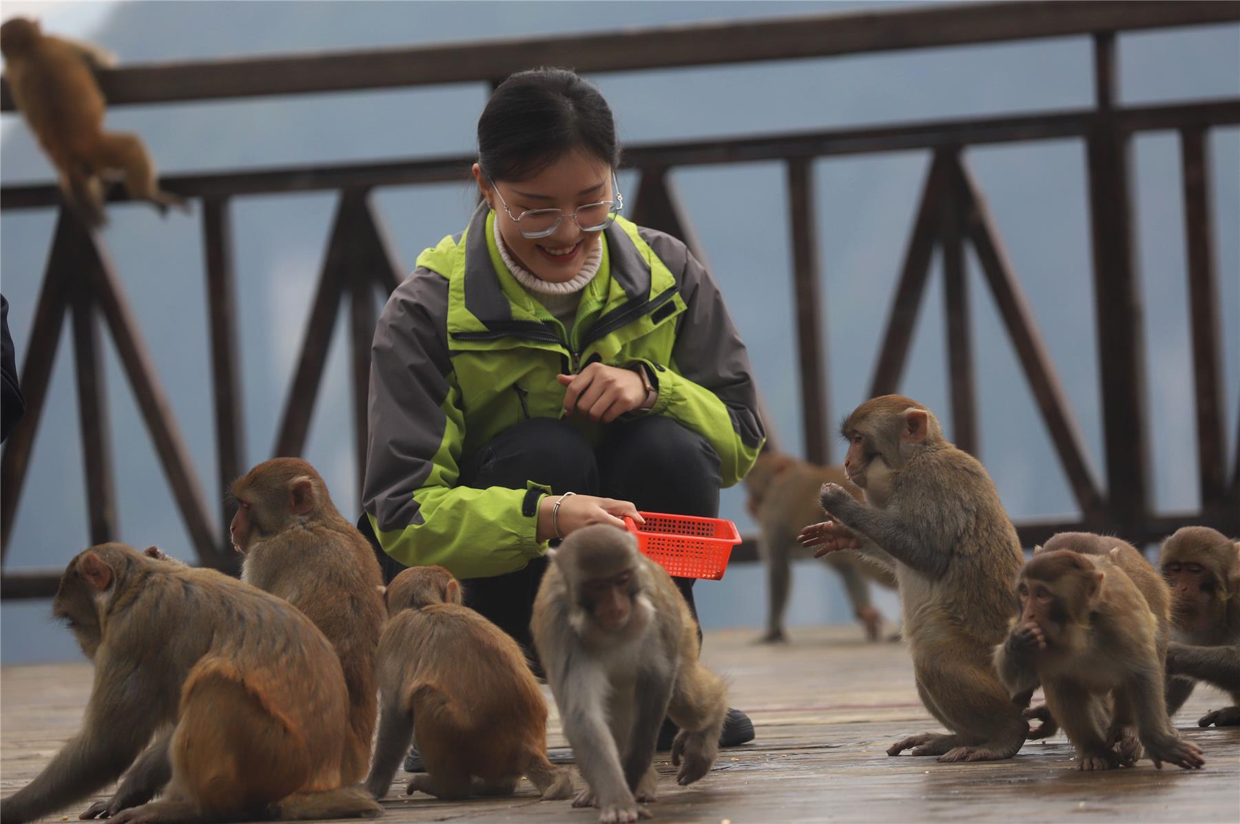“到了冬天没有足够的食物,猴群就从山上转移到了山下,景区专门安排了专门的饲养人员,设置了9个不同的投食点,每天投放食物。这样,猴子就有足够的食物,安稳地度过这个冬天了。”扶泊庆介绍道,就这样,饲养人员定时喂养,成群的猴子每天来此觅食,已经成为了景区内一道有趣的风景线。