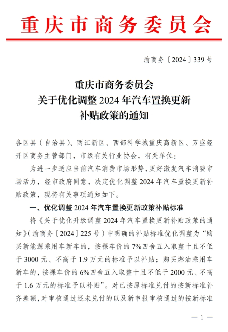 11月19日,重庆市商务委员会发布《关于优化调整 2024年汽车置换更新补贴政策的通知》,将补贴标准优化调整为“购买新能源乘用车新车的,按裸车价的7%四舍五入取整十且不低于 3000 元、不高于1.9万元的标准予以补贴;购买燃油乘用车新车的,按裸车价的 6%四舍五入取整十且不低于 2000 元、不高于1.6万元的标准予以补贴”。
