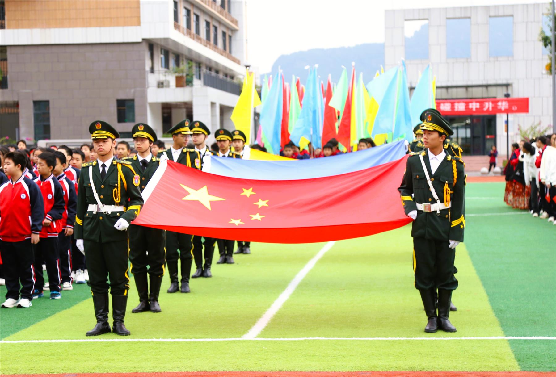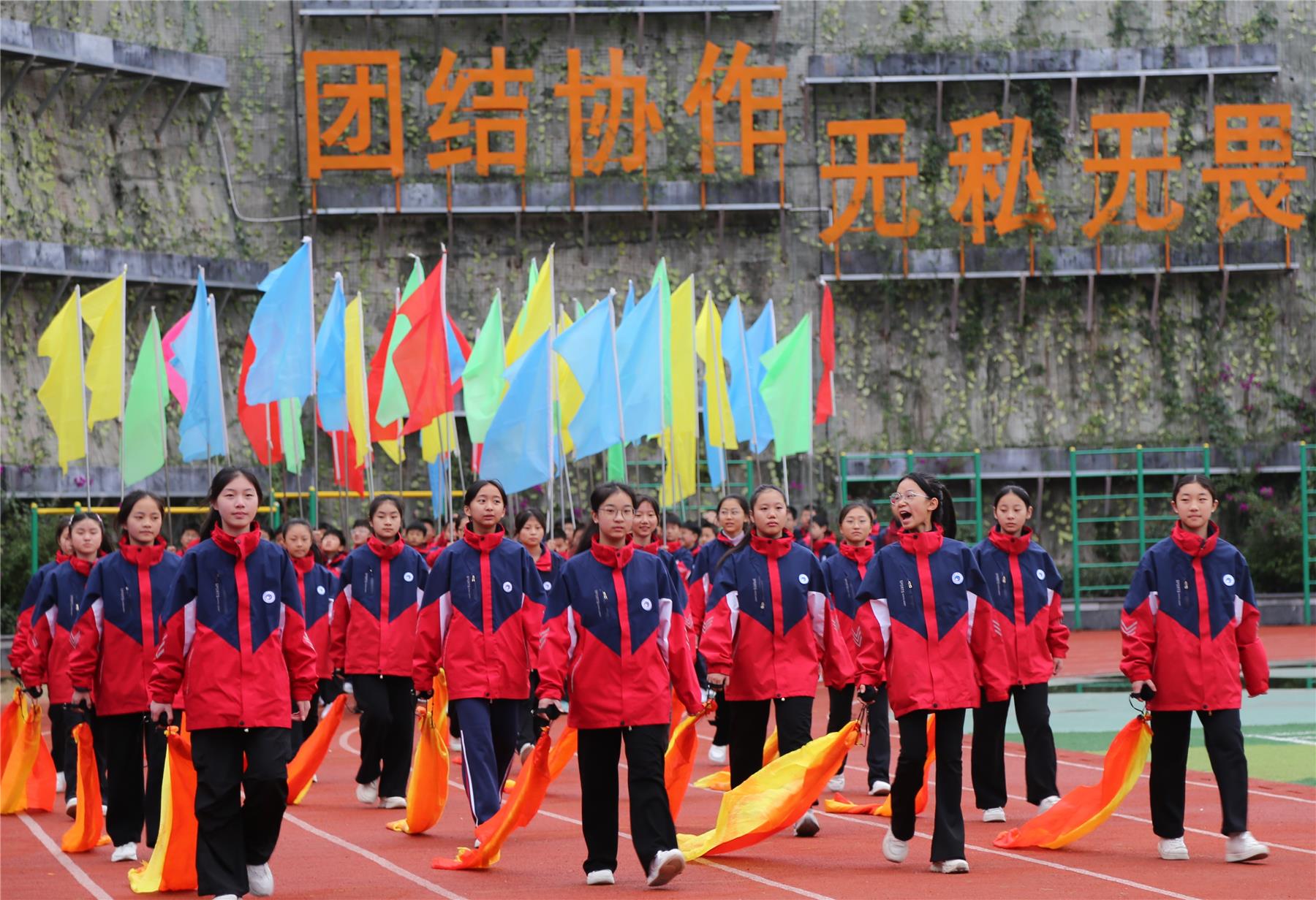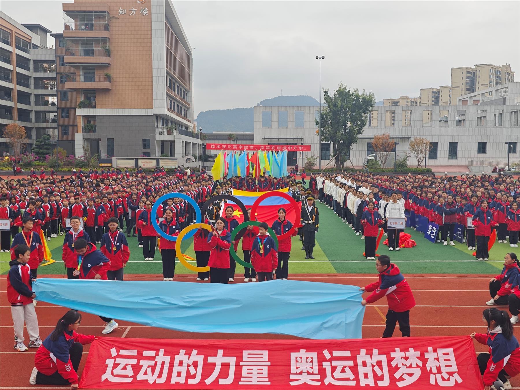 在激昂、雄浑的《运动员进行曲》旋律中,开幕式精彩上演。伴随着生动的解说,国旗方阵率先步入会场,引领着这场盛大的庆典。紧随其后的是校旗方队和校徽方队,他们步伐矫健,气势如虹,依次通过主席台。