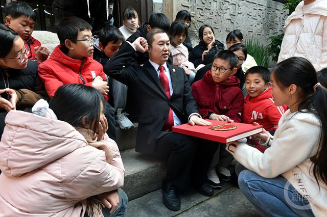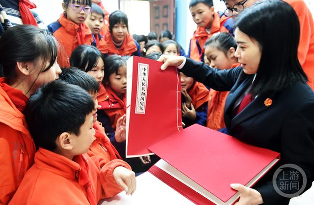普法干警为孩子们打开《中华人民共和国宪法》宣誓本,聆听宪法誓词的精准内涵和所代表的价值观。