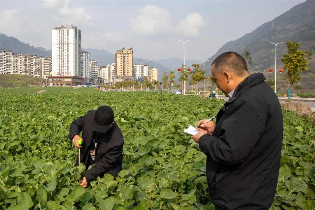 眼下,正值油菜生长期。陈昌民带领村民来到油菜种植基地,按照田间测产验收的调查方法及技术要求,测量油菜的株行距,并记录油菜绿叶数、根颈粗等基础数据,了解油菜的生长情况。村民熊坤生笑呵呵地说:“根据现在的长势,今年大概每亩能收400斤到500斤油菜籽。”