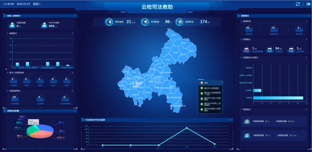 “云检司法救助一件事”应用整合多部门数据资源,实现智能筛查救助线索、自动生成救助方案、协同开展综合救助、线上办理资金审批,主动筛查覆盖比例从9.8%提高至100%,案件办理平均时长从10天缩短至5天,拨付周期从30天缩短至15天。应用入选区县典型应用“三个一批”复制推广名单、全市检察机关唯一,在全市贯通上线,实现“一地创新、全市共享”。