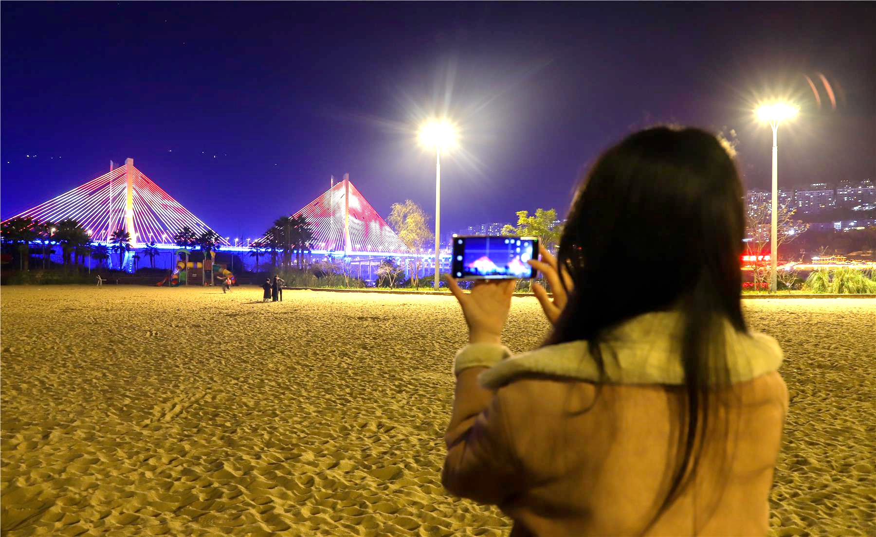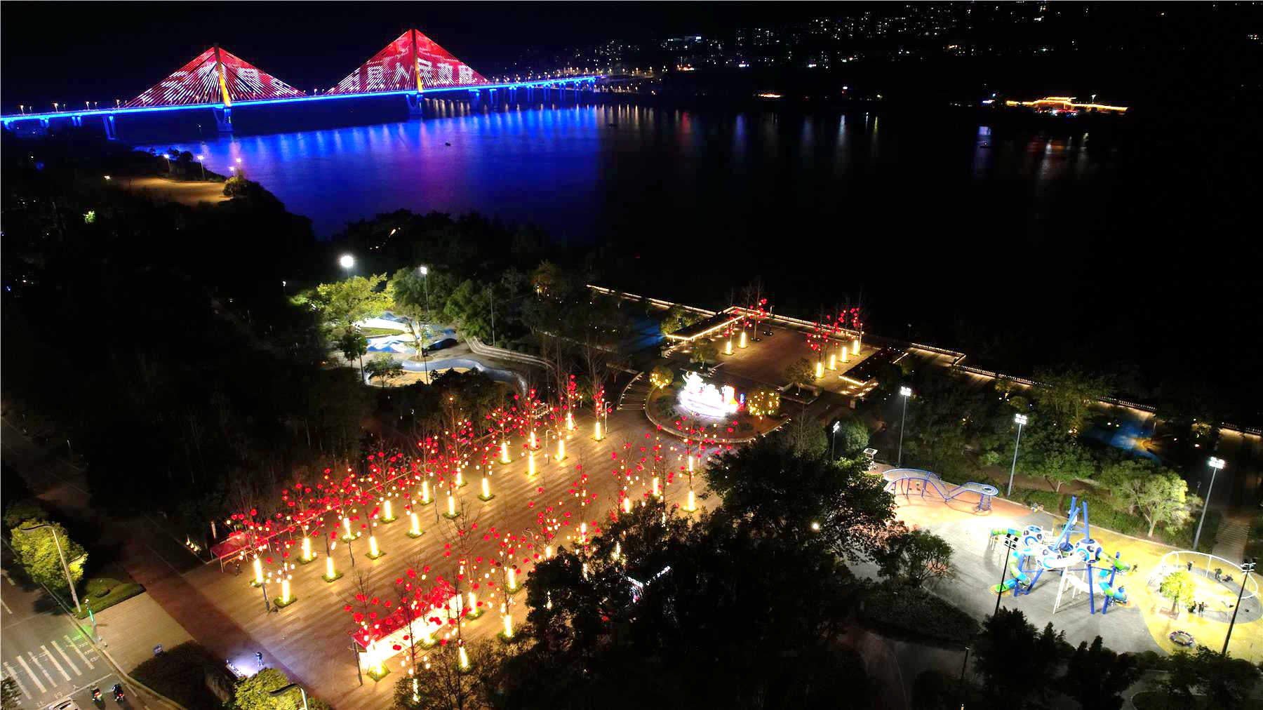 “今年云阳的迎春灯饰非常有年味,长江大桥灯光秀有很多云阳的元素,比如恐龙IP、云阳的山水等。我从远处看,长江大桥和长江融为一体,相互映衬,如梦如幻,大桥的光影倒映在波光粼粼的江面上,勾勒出五彩斑斓的效果,让城市的夜变得风情万种、绚丽多姿。”市民刘争钇说。