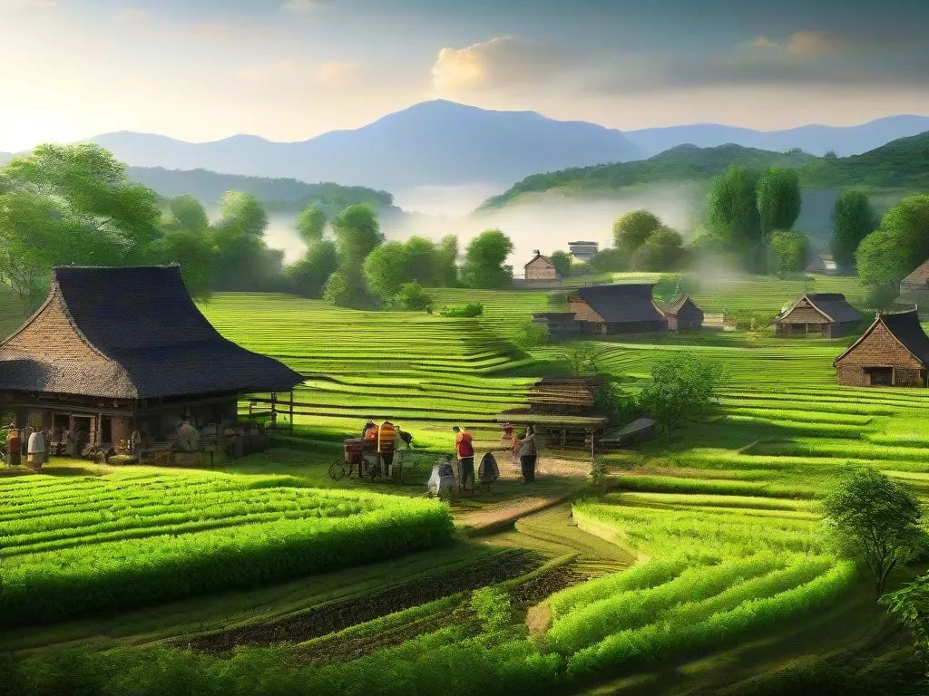 画面中是一片宁静的田园风光,金黄的稻田随风起伏,形成一片金色的海洋。田间的小路上,几位农民正弯腰劳作,脸上洋溢着丰收的喜悦。远处的村庄炊烟袅袅,几座古朴的农舍掩映在绿树丛中,显得宁静而温馨。果园里,果树挂满了沉甸甸的果实,孩子们在树下嬉戏,笑声回荡在田野间。