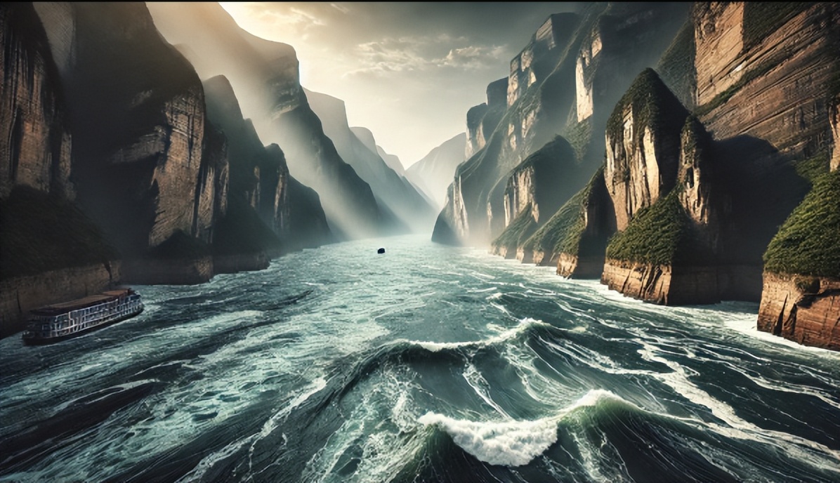 长江如一条巨龙蜿蜒穿行于群山之间,江水奔腾不息,浪花拍打着两岸的礁石,发出轰鸣的声响。江面上,几艘古老的木船顺流而下,船夫们喊着号子,与江水的咆哮声交织在一起。远处,三峡库区的青山如黛,云雾缭绕,仿佛一幅水墨画。江岸边的纤夫石上,刻满了岁月的痕迹,诉说着千百年来长江船工的艰辛与坚韧。