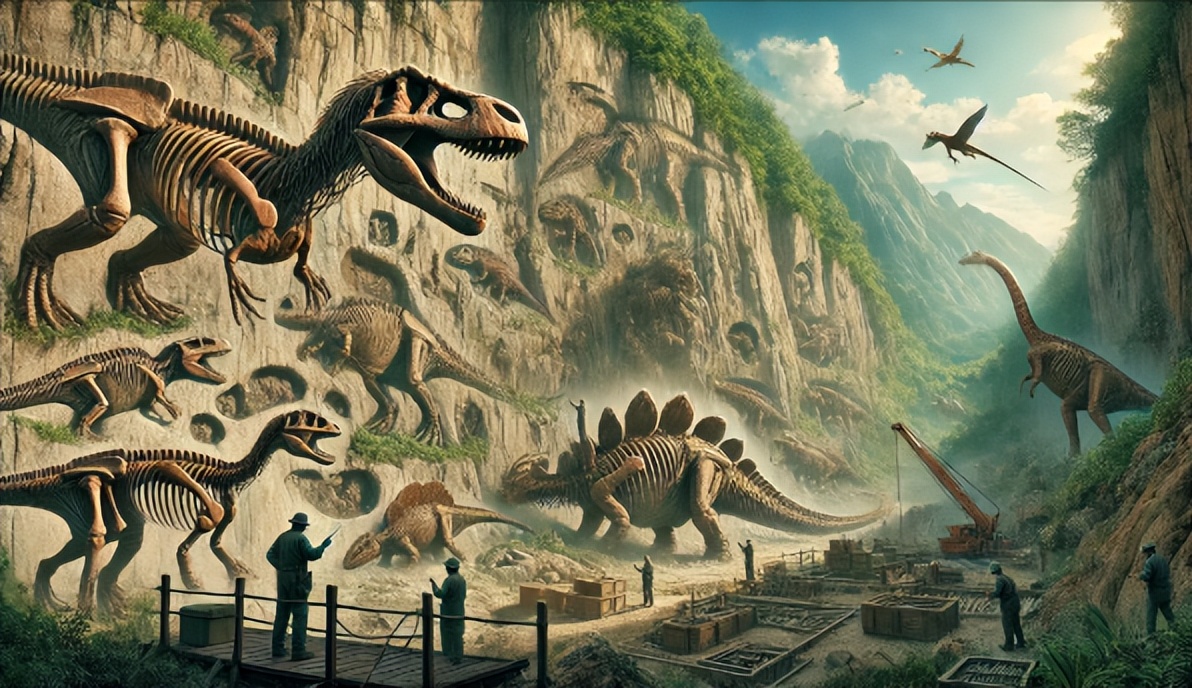 一片广袤的化石发掘现场,巨大的恐龙骨架化石从泥土中显露出来,仿佛在向人们展示亿万年前的远古世界。化石墙上,密密麻麻的骨骼交错排列,有的完整,有的残缺,仿佛在诉说着恐龙时代的辉煌与灭绝。考古工作者们正在小心翼翼地清理化石,周围的青山绿水和现代科技设备形成鲜明对比,给人一种时空交错的感觉。