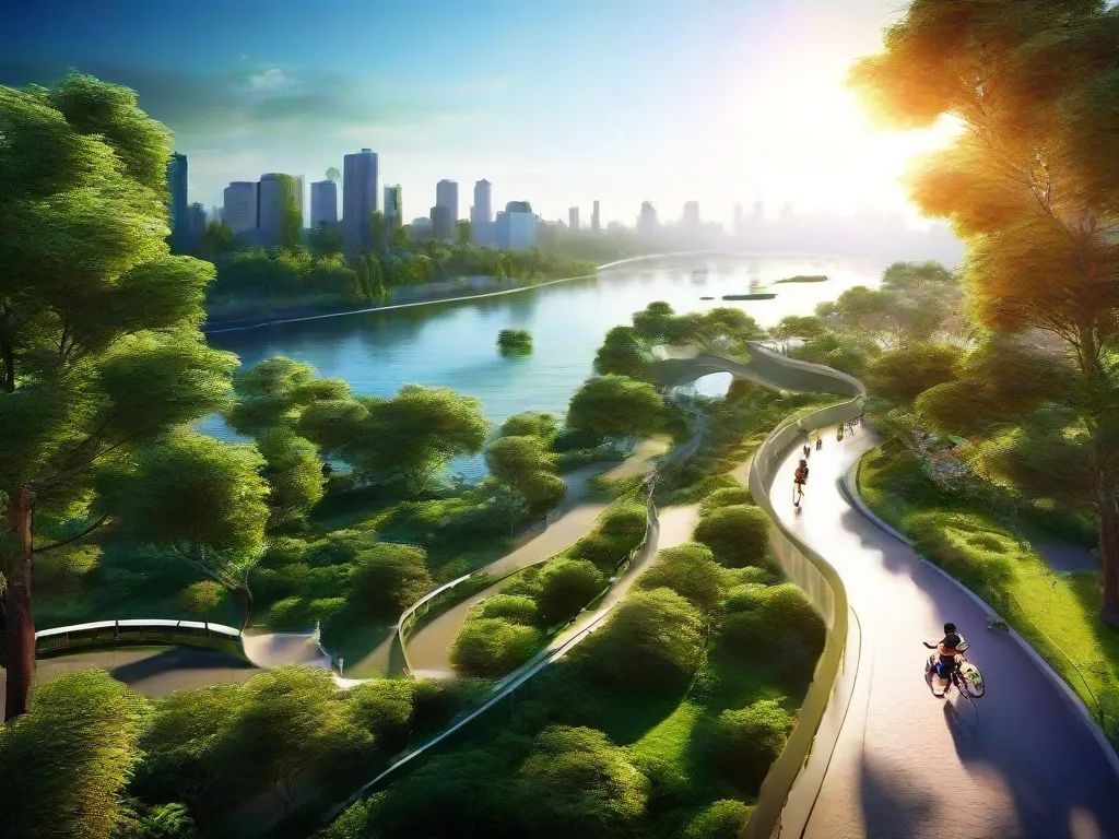 环湖绿道如一条翡翠项链环绕着城市,绿树成荫,鲜花盛开。清晨,阳光洒在湖面上,波光粼粼,几只白鹭在湖边觅食,显得悠闲自在。市民们或跑步、或骑行、或散步,脸上洋溢着幸福的笑容。绿道旁的草坪上,孩子们在嬉戏打闹,老人们在长椅上晒太阳,一幅和谐美好的生活画卷。