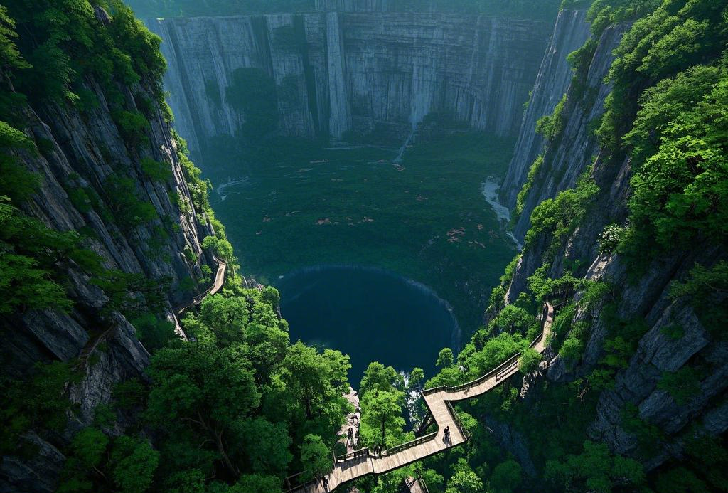 龙缸天坑如同一口巨大的深井,直插地心,四周是陡峭的悬崖,崖壁上长满了青苔和藤蔓。天坑底部云雾缭绕,深不可测,仿佛通往另一个世界。栈道如一条细线缠绕在悬崖边缘,游客们小心翼翼地行走其上,头顶是蓝天白云,脚下是万丈深渊。远处,几只飞鸟掠过天坑上空,发出清脆的鸣叫声,为这幅画面增添了一丝生机。