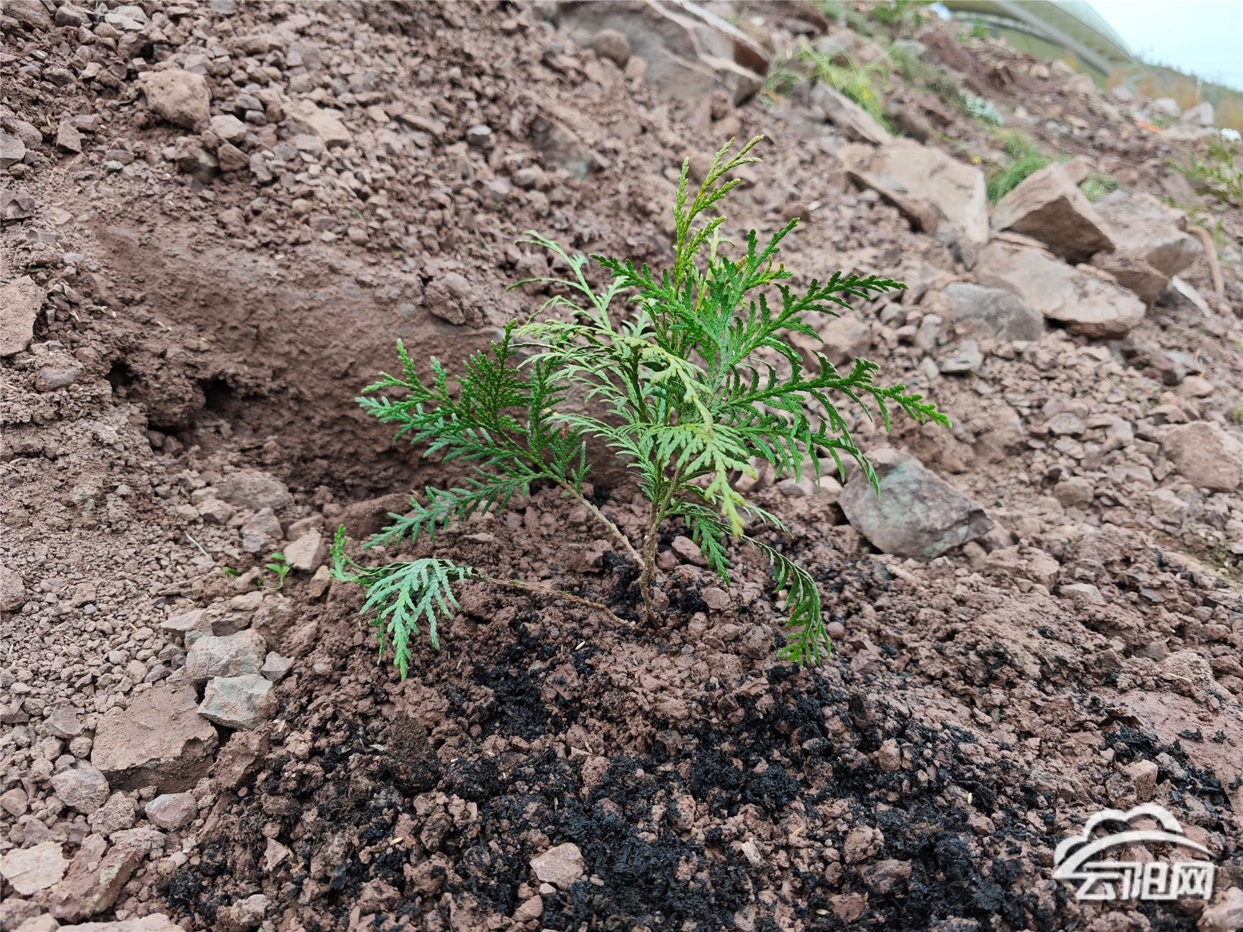 在植树现场,工人们正忙碌着将崖柏幼苗搬运至田间,大家在专业技术员指导下,挥锹刨坑、扶苗培土、提水浇灌...不一会儿,一株株小幼苗在这里安了家。此刻,跨越亿年的“双向奔赴”,恐龙化石遇见了恐龙时代的“活化石”。