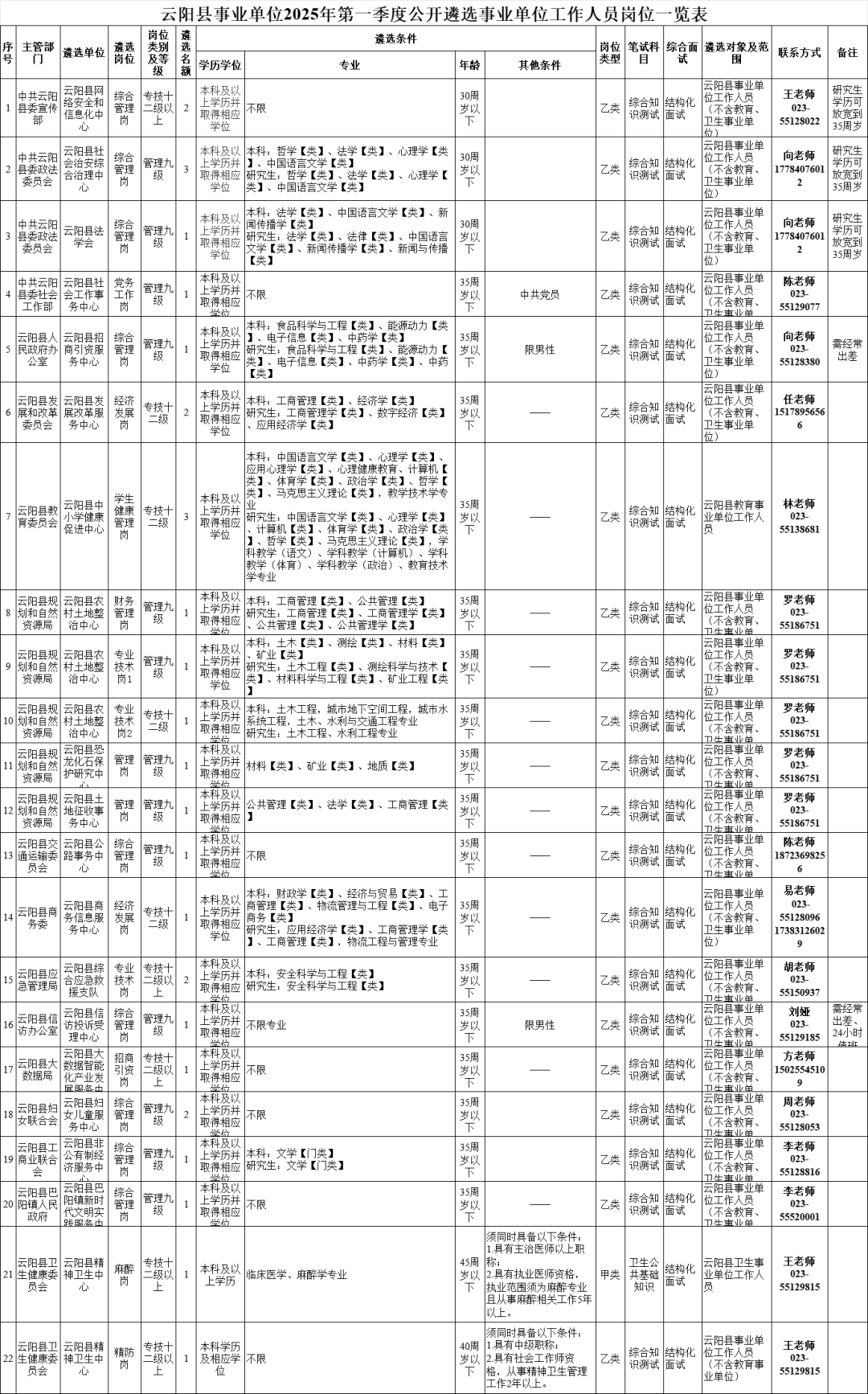 本次遴选事业单位工作人员30名,具体单位、岗位详见《云阳县事业单位2025年第一季度公开遴选事业单位工作人员岗位一览表》。