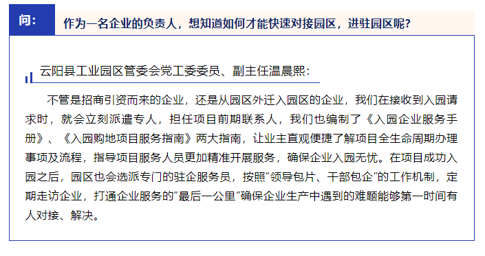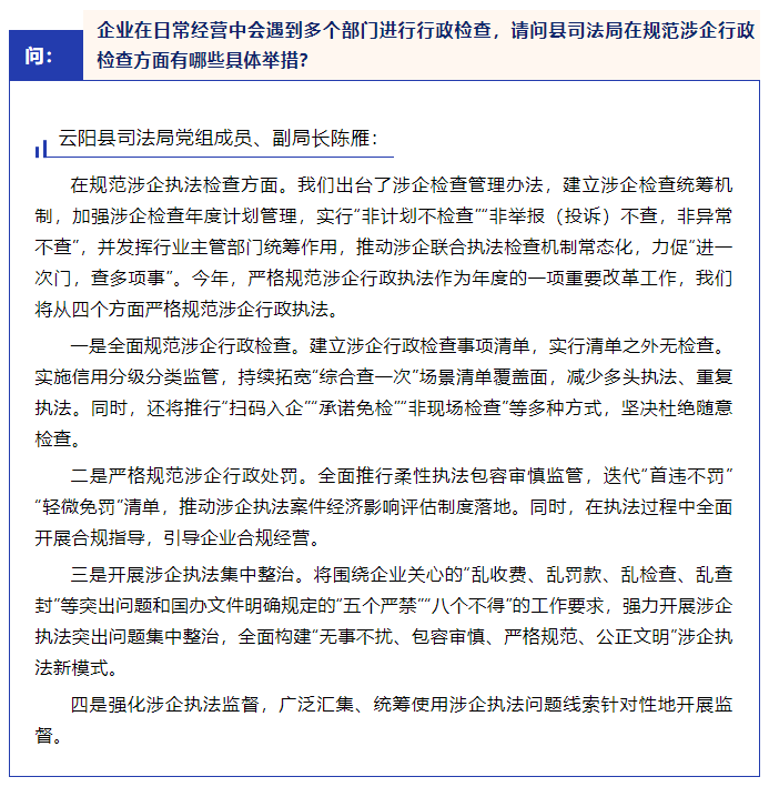 会上,发布人就推动民营经济高质量发展政策作详细介绍,县发展改革委、县司法局、县人力社保局、县商务委、县工业园区管委会等部门单位分别围绕企业关心的政策申报、保障措施、反馈渠道等问题进行答复。