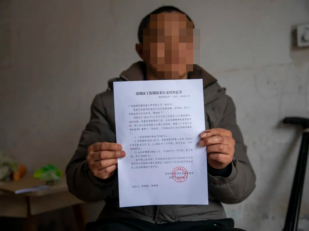 2025年2月,张某兵收到了深圳市社会保险基金管理局大鹏分局的办结文书:先行支付一次性伤残补助金、伤残津贴以及生活护理费共计47.6万元,并从2025年1月开始每月发放伤残津贴和生活护理费。张某兵拿着决定书,回想十年来的心路历程,流下了欣喜的眼泪。