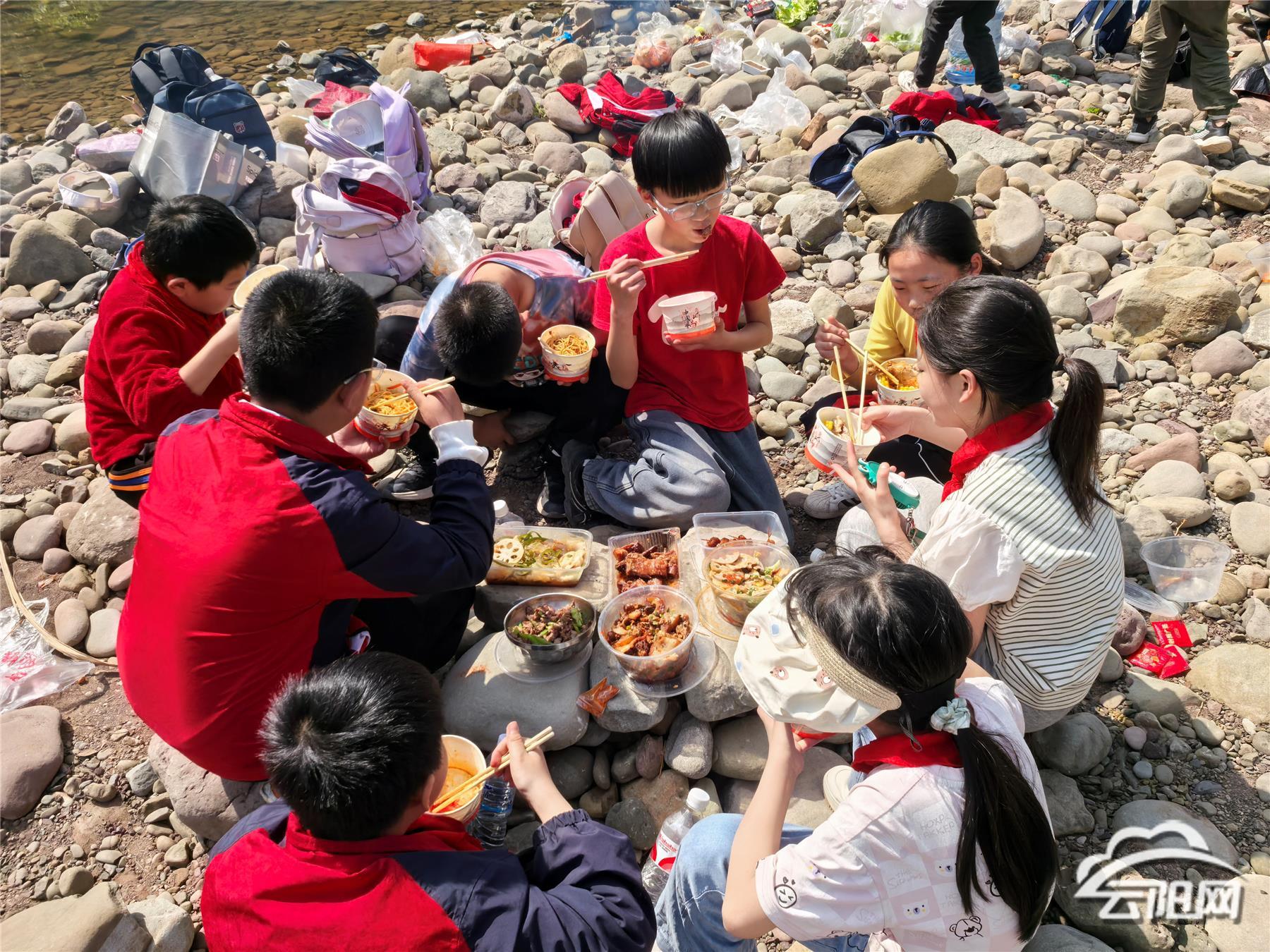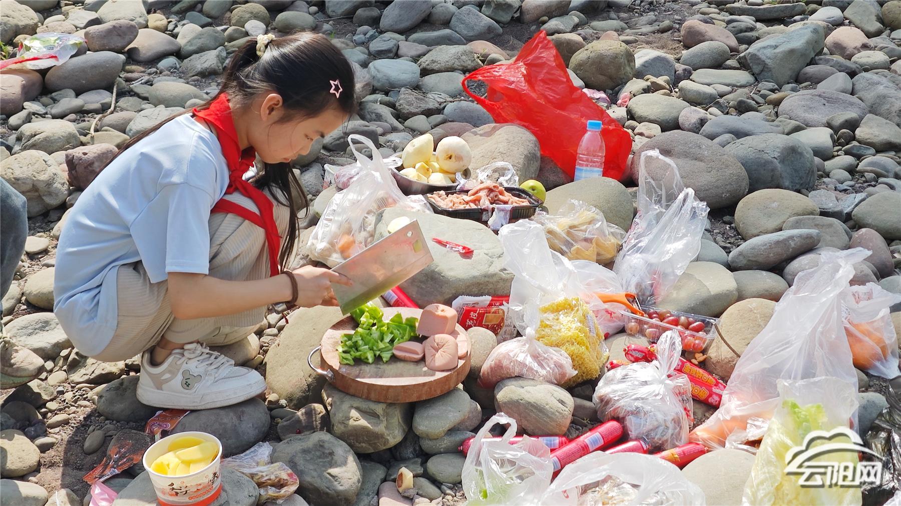 活动当天,在老师的带领下,孩子们像一群欢快的小鸟,带着锅碗瓢盆、各类食材,秩序井然地前往千丘河附近。一到目的地,大家便迅速分工。8-12人为一个小组,有的在土坑旁忙碌搭建“灶台”;有的化身“小厨神”,专注地挥舞菜刀;负责掌勺的同学挥舞着锅铲,翻炒着食材。不一会儿,一道道色香味俱全的菜肴就出锅了,有香气扑鼻的炒土豆丝、翠绿欲滴的炒青菜……