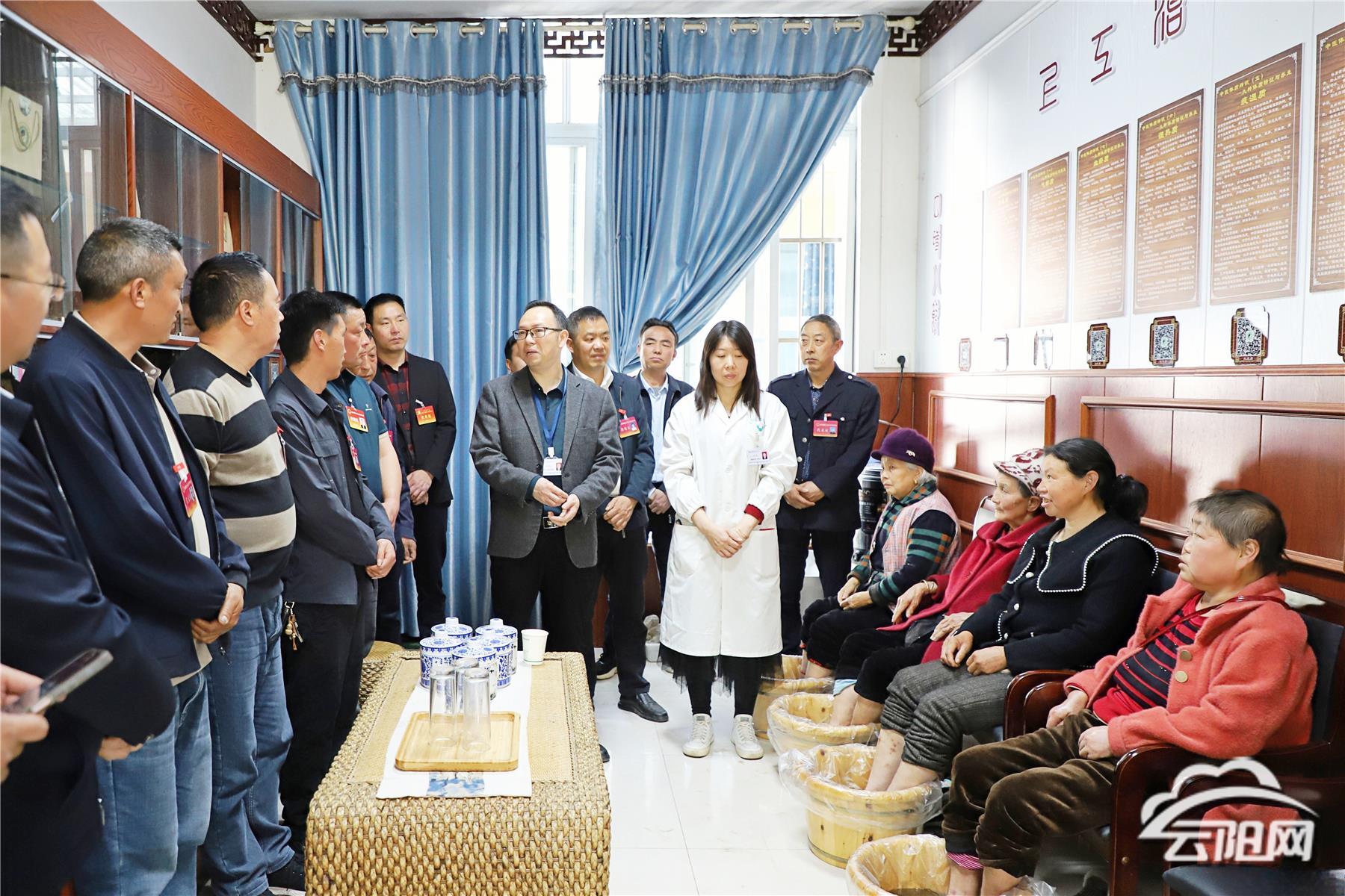 活动中,代表们参观了镇卫生院中医药治未病体验馆、公共卫生科、康复理疗科及中医文化长廊,认真听取了镇卫生院公共卫生服务工作汇报。代表们特别关注到,中医治未病体验馆座无虚席,该院开发的“社区养老养生+‘八段锦、太极拳、五禽戏’健身+中医适宜技术+中医护理康复服务+茶饮”的“个性化服务包”,深受老百姓青睐。在公共卫生科窗口,正在兑换积分的李大爷乐呵呵地说:“我们来参加健康检查、知识讲座和咨询活动,可以得到积分,然后又可以用积分来兑换生活用品和特色医疗服务,这个‘积分制’搞得好!”