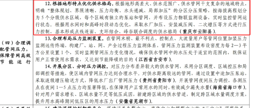 云阳是典型的山地城市,根据地形高差大、供水范围广、供水管网干支复杂的地域特点,明确了“整体规划、界限清晰、压力均衡、水头递减、局部加压”的分区分压策略,按海拔高程划分为5个分级供水区域、4个二级分区、50个三级分区,对辖区所有住户水压实行“分区定制”,每个区域有独立的泵站和管网,并布设压力物联监测设备,实时监控管网运行状态。根据用水闲时和高峰时段动态优化,采取水厂加压、安装减压阀、二次增压等方式进行压力控制,基本形成点线连面、支环结合、峰谷联合调度的供水格局。