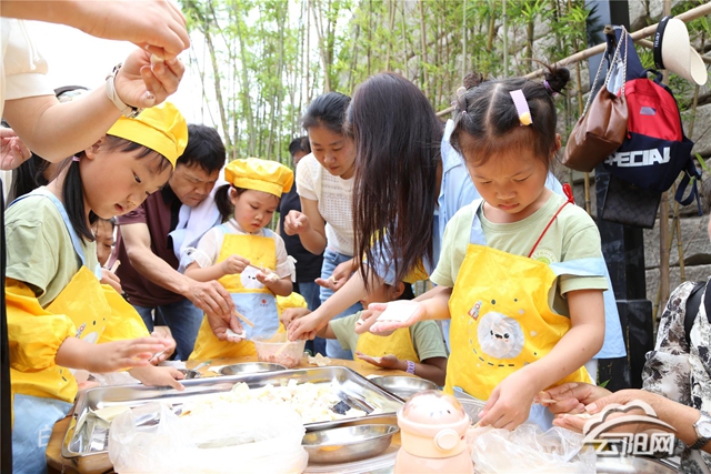 据园长周芙蓉介绍,这场以“云阳见面 欢乐无限”为主题的活动,将非遗技艺、家乡文化与端午习俗巧妙融合,围绕“绝景”“绝艺”“绝味”“绝技”四大板块,鼓励孩子全程参与策划。从设计摊位海报到编排舞台节目,孩子们在沉浸式体验中触摸传统文化肌理,在趣味互动里厚植家国情怀,让这个儿童节既有欢笑,更有文化的温度。