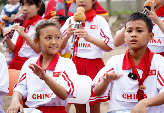 葫芦丝方阵与中埃塞混血儿童张中华、张艳带领的非洲鼓队同台演奏