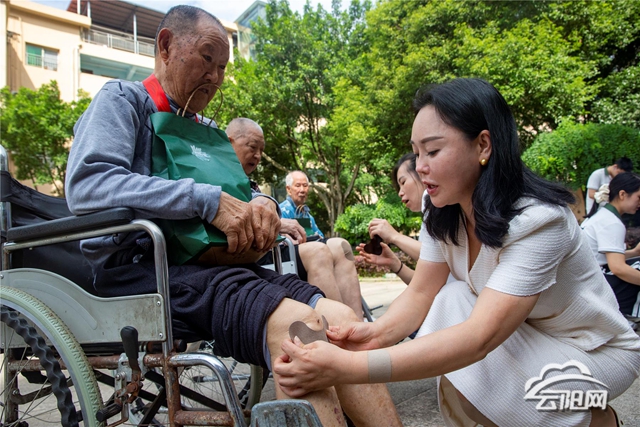 活动中,2025年获评全国劳模的徐靖雯用朴实真挚的语言,结合自身经历,分享了服务社会、奉献爱心的感人事迹。专业讲师余长江则聚焦老年人夏季养生需求,以“夏季艾灸养生与常见病预防”为主题,通过图文讲解和现场演示,传授实用的健康知识。随后,由中医专家和艾灸师组成的专业志愿者团队,针对院内30余名老人普遍存在的关节疼痛、腰椎不适等常见问题,提供了一对一的艾灸理疗服务,细致入微地进行精准调理。