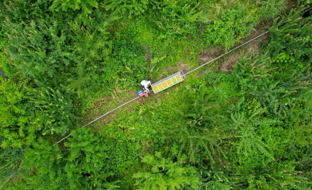 脚下山间,单轨“小火车”沿着山脊平稳运行
