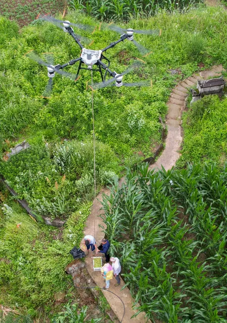 无人机飞手胡钢正操控设备吊运装满青梅的货箱