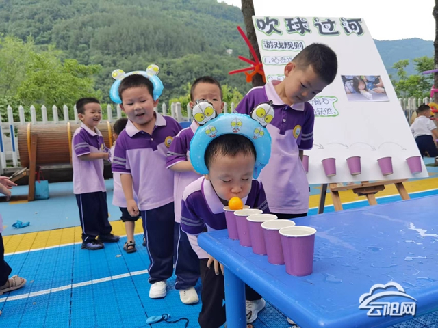 活动伊始,孩子们在布置好的打卡区有序签到,留下入园的第一张纪念影像。签到结束后,孩子们参与了抢椅子、踩气球、蒙眼敲锣、吹球过河、快乐套圈等游园活动。其中“吹球过河”游戏最受青睐,孩子们戴着青蛙等可爱头饰,专注地吹动杯中的球,围观的小伙伴们加油声不断,活动现场充满了欢声笑语。