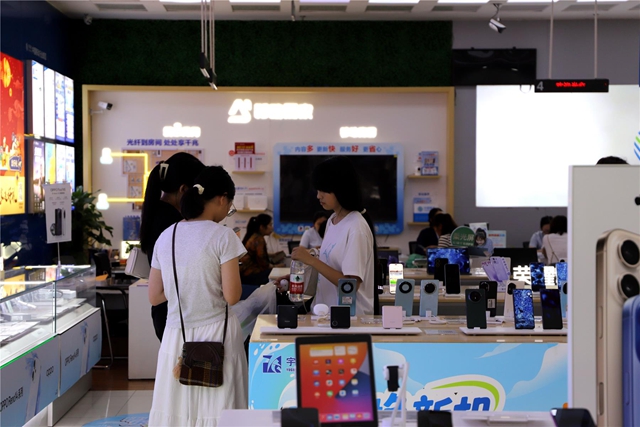 在云江大道中国移动营业厅内,前来选购电子产品的学生和家长络绎不绝。消费者朱红健表示:“看中的手机凭准考证领取了100元补贴,办理电话卡还有优惠,很划算。”