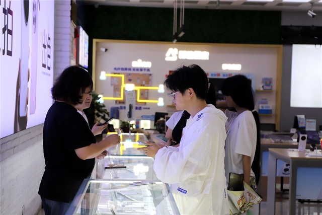 近日,记者走访城区多家电子产品销售门店,看到店内人气爆棚。展示台上,各类手机摆放得整整齐齐,不少家长专程带着孩子前来挑选电子产品,大家穿梭于各个展区之间,认真对比不同产品的性能与价格。