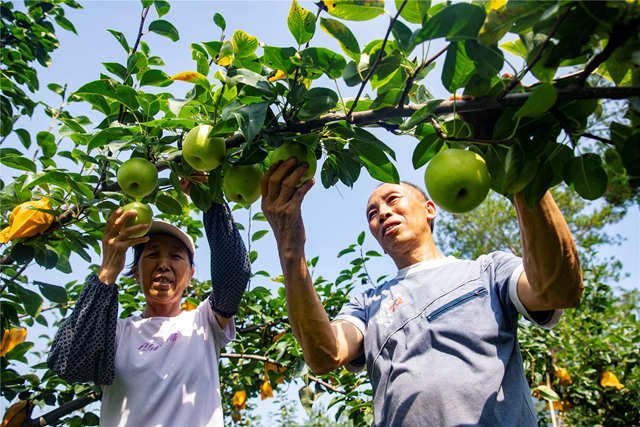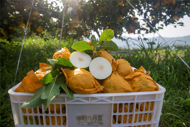 走进海拔800至1000米的梨园,郁郁葱葱的枝叶间,硕大的雪梨挂满枝头。轻轻解开白色或黄色的保护袋,饱满的果实散发出诱人的果香。剖开梨子,晶莹剔透的果肉汁水丰盈,令人爱不释口。因肉质雪白、农历六月成熟,当地果农亲切地称之为“雪梨”或“六月雪”。其卓越品质获得了官方认证——2024年11月,该基地雪梨经中国绿色食品发展中心审核,被认定为绿色食品A级产品,获准使用绿色食品标志。