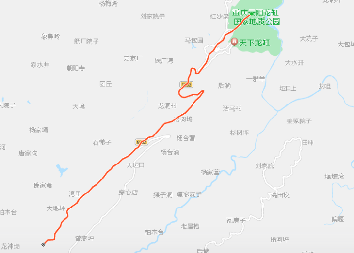 龙缸景区北门天河广场(起点)→龙缸景区游客中心→黄金洞→岐山草场大门→草原逸居大门(终点),全程约15km。