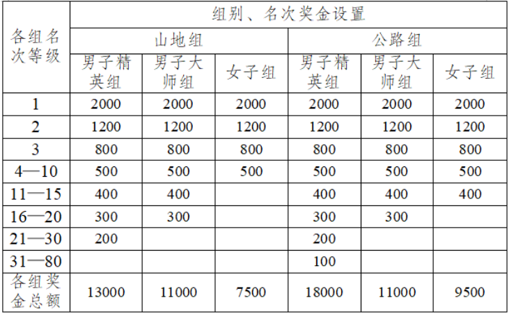 1. 各组别参赛运动员按照到达终点的顺序排定名次,分别获得相应奖金。如果出现并列名次的,则按照并列名次录取,且不再设置下一名次;税前奖金设置(单位:人民币/元):