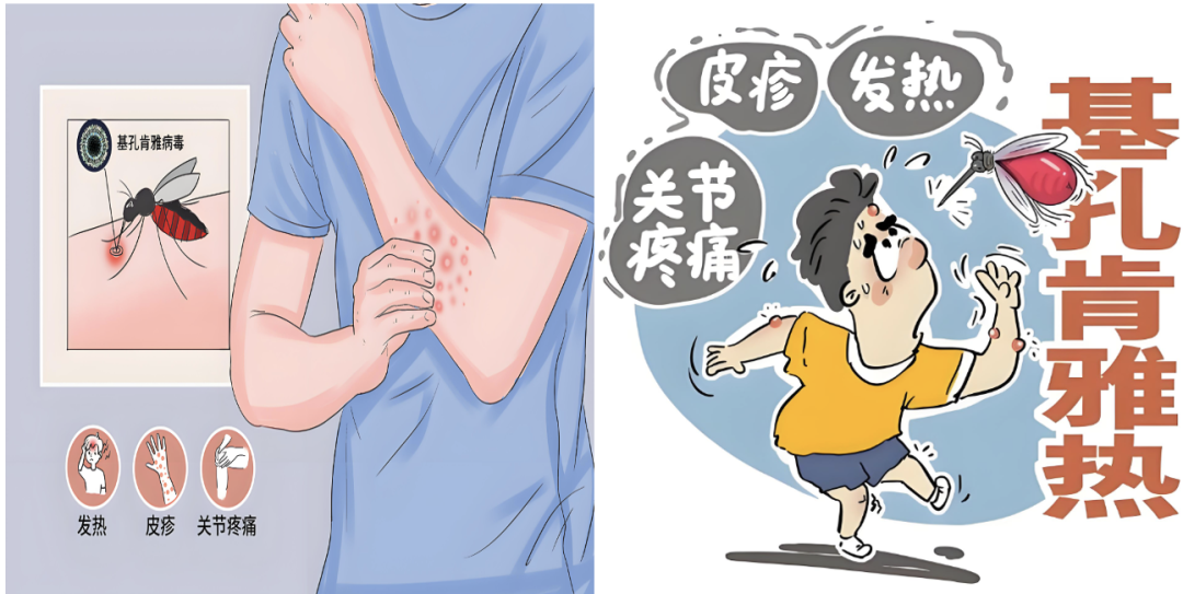 这些症状与登革热和寨卡病毒感染等其他感染的症状类似,病例可能被误诊。重症高风险人群包括围产期感染的新生儿、65周岁及以上老年人以及患有高血压、糖尿病或心脏病等基础疾病的患者。多数患者一周内会好转,部分病例关节疼痛的症状可能会持续数月甚至数年。