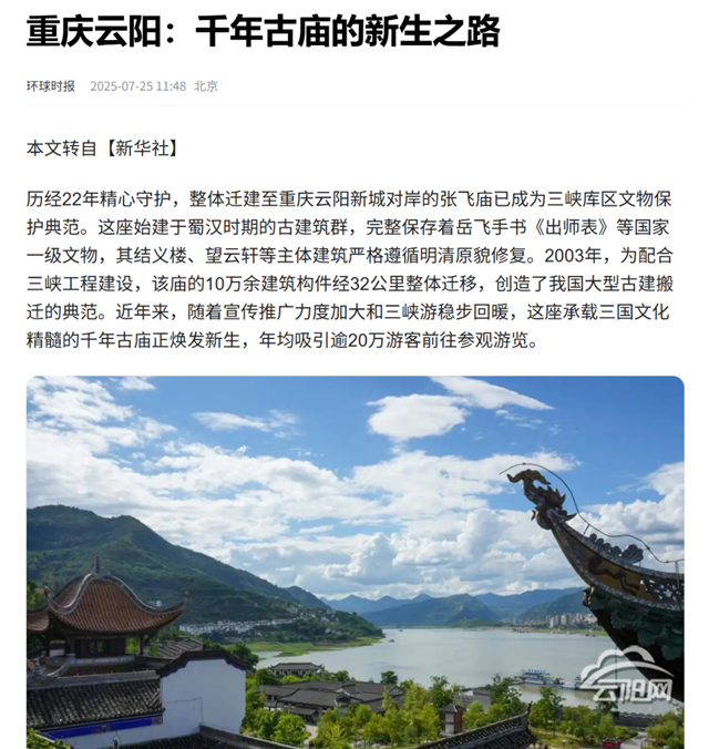 历经22年精心守护,整体迁建至重庆云阳新城对岸的张飞庙已成为三峡库区文物保护典范。这座始建于蜀汉时期的古建筑群,完整保存着岳飞手书《出师表》等国家一级文物,其结义楼、望云轩等主体建筑严格遵循明清原貌修复。2003年,为配合三峡工程建设,该庙的10万余建筑构件经32公里整体迁移,创造了我国大型古建搬迁的典范。近年来,随着宣传推广力度加大和三峡游稳步回暖,这座承载三国文化精髓的千年古庙正焕发新生,年均吸引逾20万游客前往参观游览。