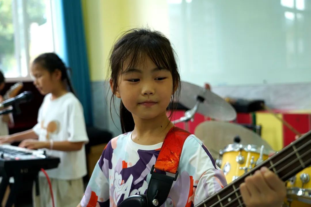 随后越来越多的学生加入了这个队伍。于是在2024年10月底,学校成立了乐团。古筝、吉他、架子鼓......各种乐器在学生们的手中焕发出独特的魅力,他们在乐团中各自闪闪发光。2025年5月,又一个大胆的想法落地生根——“萤河计划”电声乐队正式成立。