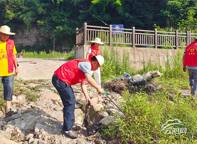 清理现场,党员干部和志愿者们手持垃圾袋、夹子、砍刀等工具,全力投入清障保洁工作。他们分工协作,打捞水面漂浮物,清理沿岸堆积的塑料袋、饮料瓶、废旧衣物等垃圾,并砍除杂枝、疏通河道,确保水流畅通。烈日当空,汗水浸透了大家的衣衫,那一抹志愿红成为河岸线上最动人的风景。经过两个多小时的集中清理,泥溪河沿岸环境焕然一新。大家在酷暑中不惧脏、不喊累,用实际行动诠释了奉献、担当的志愿服务精神。