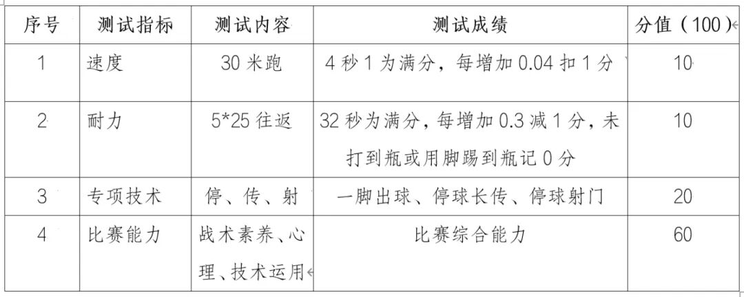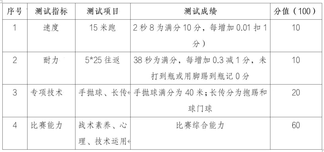 (一)请参与选拔的运动员需携带运动装备(训练服、足球鞋、护腿板),并提前抵达训练场;在进行每项测试前,受测队员自行进行热身,避免受伤。