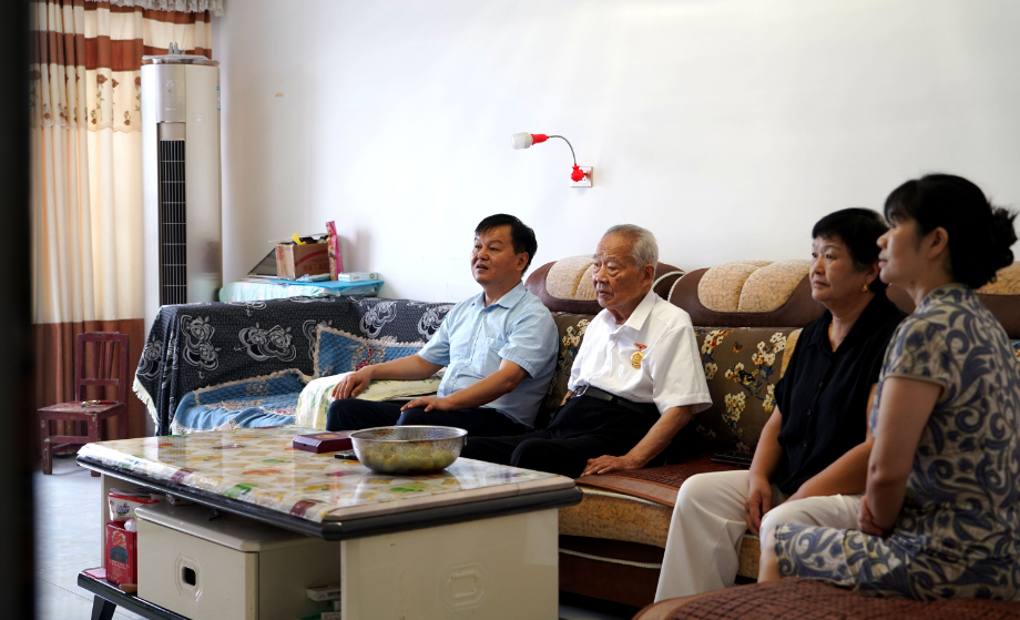 现年102岁的抗战老同志陈治界和家属一同观看阅兵式