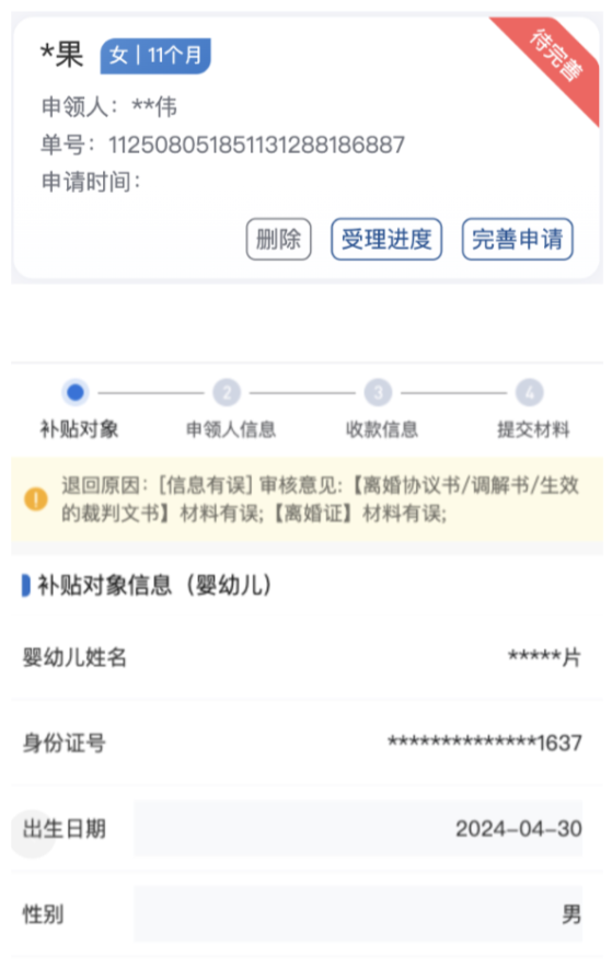 ②点击首页的【完善申请】按钮,或“进度”页面中的【完善申请】按钮,可以继续修改信息,最上方会显示退回原因,方便申领人修改对应信息。