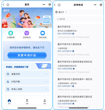 答:进入“育儿补贴申领”页面,点击上方的“咨询电话”,输入关键词,可搜索您对应区县/街道/社区的值班电话,有任何疑问,都可拨打咨询。