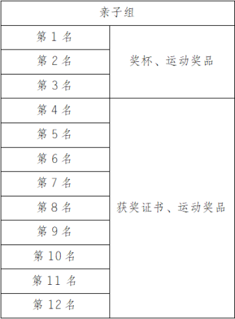 亲子组录取前十二名,前三名以发枪的时间为准录取,后面净计时录取。亲子组最终成绩以该组最后一名选手越过终点线的时间为准,该时间即为本组的完赛时间。成绩前3名授予奖杯一座,运动奖品一份,第4-12名授予获奖证书一份,运动奖品一份。奖励见下表: