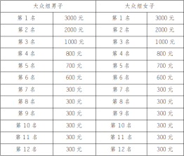 录取男女前十二名,前三枪声录取,后面净计时录取,男、女前三名安排颁奖仪式;奖金见下表(单位:人民币/元):